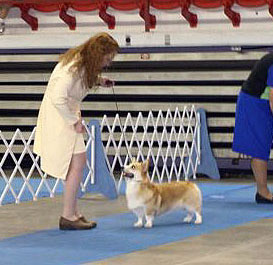 Cal has three BOBs from the BBE under herding breeder judges Teddy McDowell, Harlowe Jahelka, and Beth Lachnitt. Cal and I stepped into BredBy at the 2005 PWCCA National with breed friends, idols & icons. Anne Bowes made my national with kind comment after the class. ;) His next show out, Mar.'06 Columbia, MO--the four point major in dogs was awarded by Mr. Paul Thomann, to finish Cal here in the states. |